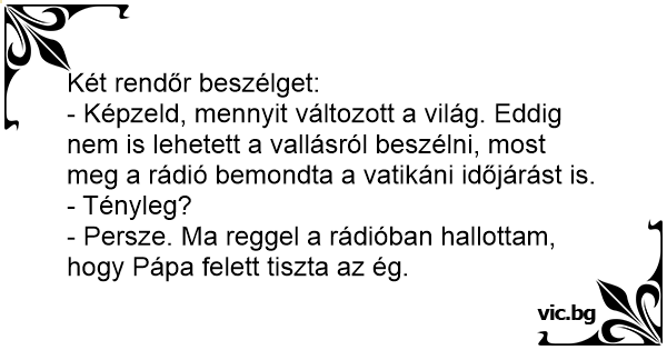 - Képzeld, mennyit változott a világ. Eddig nem is lehetett a vallásról beszélni, most meg a rádió bemondta a vatikáni időjárást is.