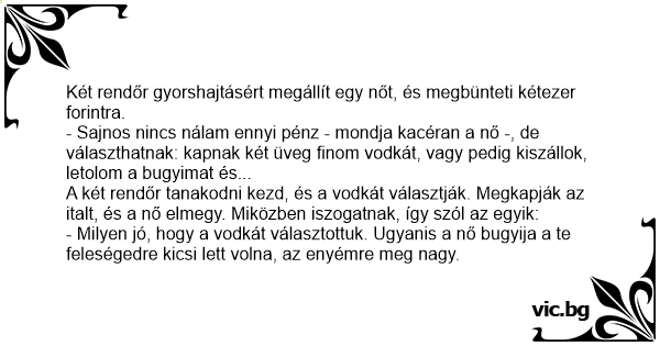 - Milyen jó, hogy a vodkát választottuk. Ugyanis a nő bugyija a te feleségedre kicsi lett volna, az enyémre meg nagy.
