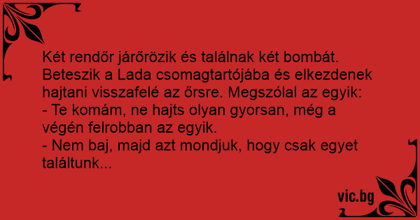 Két rendőr járőrözik és találnak két bombát. Beteszik a Lada csomagtartójába és elkezdenek hajtani visszafelé az őrsre. Megszólal az egyik: