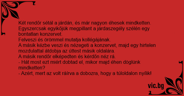 Két rendőr sétál a járdán, és már nagyon éhesek mindketten.