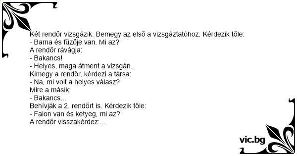 Két rendőr vizsgázik. Bemegy az első a vizsgáztatóhoz. Kérdezik tőle: