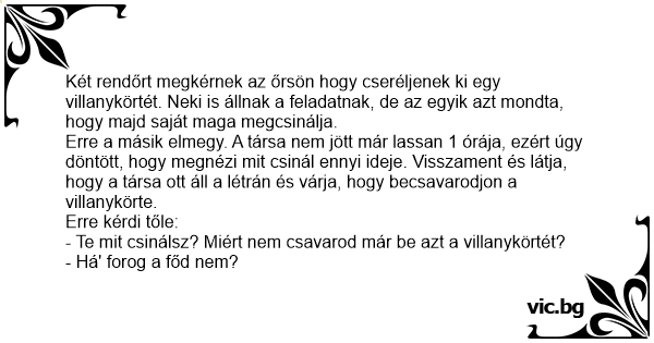 Erre a másik elmegy. A társa nem jött már lassan 1 órája, ezért úgy döntött, hogy megnézi mit csinál ennyi ideje. Visszament és látja, hogy a társa ott áll a létrán és várja, hogy becsavarodjon a villanykörte.