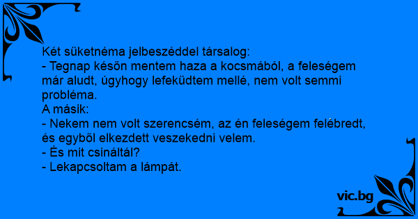- Tegnap későn mentem haza a kocsmából, a feleségem már aludt, úgyhogy lefeküdtem mellé, nem volt semmi probléma.