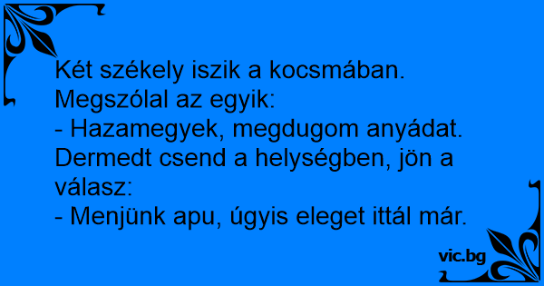 Két székely iszik a kocsmában. Megszólal az egyik:<br />- Hazamegyek, megdugom anyádat.<br />Dermedt csend a helységben, jön a válasz:<br />- Menjünk apu, úgyis eleget ittál már.