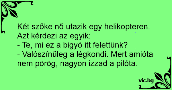 Letí dva policajti ve vrtulníku a jeden povídá druhému: „Rozbila se nám klimatizace.” „Jak jsi to poznal?” „Protože pilot se potí a ten velkej větrák nad náma se netočí.” *By Smajlicek* : - )