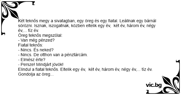 Két teknős megy a sivatagban, egy öreg és egy fiatal. Leállnak egy bárnál sörözni. Isznak, iszogatnak, közben eltelik egy év, két év, három év, négy év,... tíz év.