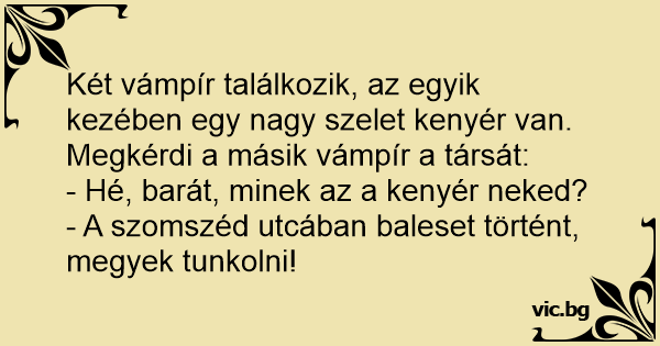 Két vámpír találkozik, az egyik kezében egy nagy szelet kenyér van. Megkérdi a másik vámpír a társát: