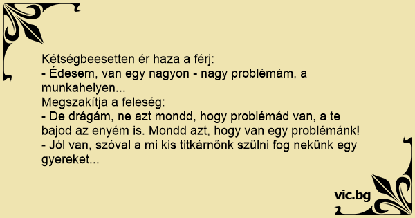 - De drágám, ne azt mondd, hogy problémád van, a te bajod az enyém is. Mondd azt, hogy van egy problémánk!