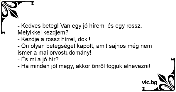 Bemegy az orvos a kórteremben fekvő pácienshez: - Van egy rossz és egy jó hírem. Melyikkel kezdjem? - kérdi a doki. - A jó hírrel, doktor úr! - feleli a beteg reménykedve. - Nos, ezt a betegséget,...