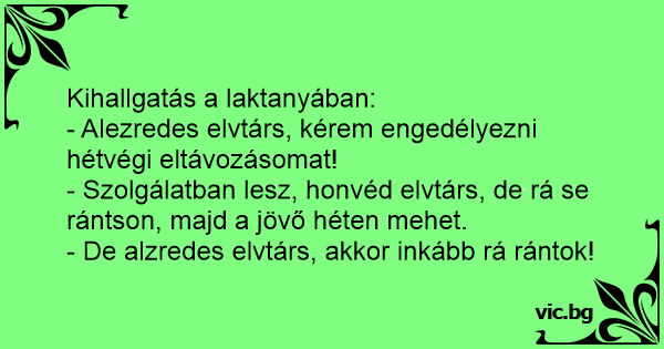 - Alezredes elvtárs, kérem engedélyezni hétvégi eltávozásomat!
