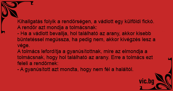 A tolmács lefordítja a gyanúsítottnak, mire az elmondja a tolmácsnak, hogy hol található az arany. Erre a tolmács ezt feleli a rendőrnek: