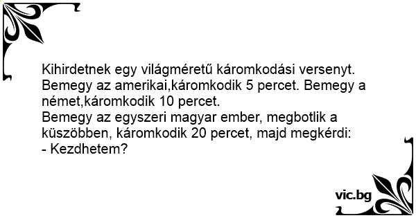 Bemegy az egyszeri magyar ember, megbotlik a küszöbben, káromkodik 20 percet, majd megkérdi: