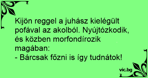 Kijön reggel a juhász kielégült pofával az akolból. Nyújtózkodik, és közben morfondírozik magában: