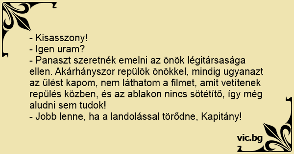 - Panaszt szeretnék emelni az önök légitársasága ellen. Akárhányszor repülök önökkel, mindig ugyanazt az ülést kapom, nem láthatom a filmet, amit vetítenek repülés közben, és az ablakon nincs sötétítő, így még aludni sem tudok!