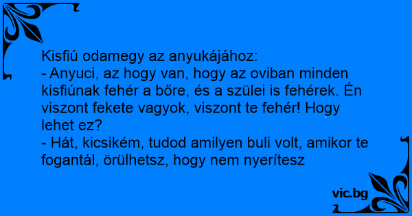 Pistike kérdezi az anyukáját: - Anya az mért van, hogy apa is, te is, az egész családban mindenki fehér, csak én vagyok fekete? - Kisfiam, ne kérdezz semmit! Amilyen buli volt, örülj, hogy nem...