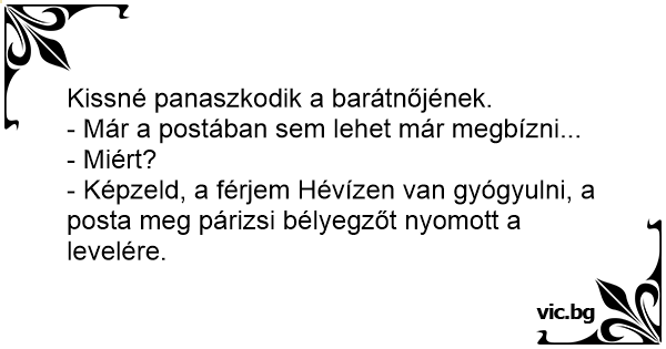 - Képzeld, a férjem Hévízen van gyógyulni, a posta meg párizsi bélyegzőt nyomott a levelére.