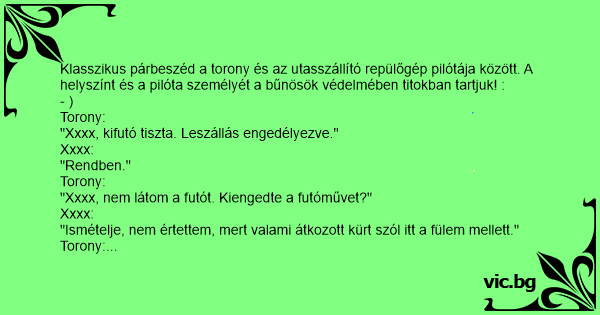 Klasszikus párbeszéd a torony és az utasszállító repülőgép pilótája között. A helyszínt és a pilóta személyét a bűnösök védelmében titokban tartjuk! :