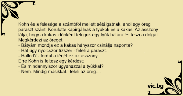 Kohn és a felesége a szántóföl mellett sétálgatnak, ahol egy öreg paraszt szánt. Körülötte kapirgálnak a tyúkok és a kakas. Az asszony látja, hogy a kakas időnként felugrik egy tyúk hátára és teszi a dolgát.