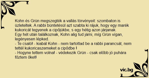 - Te csaló! - kiabál Kohn - nem tartottad be a rabbi parancsát, nem tettél kukoricaszemeket a cipődbe !