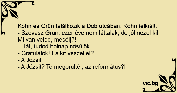 Kohn és Grün találkozik a Dob utcában. Kohn felkiált: