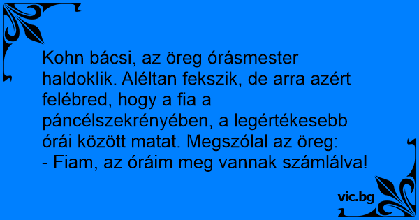 Kohn bácsi, az öreg órásmester haldoklik. Aléltan fekszik, de arra azért felébred, hogy a fia a páncélszekrényében, a legértékesebb órái között matat. Megszólal az öreg:
