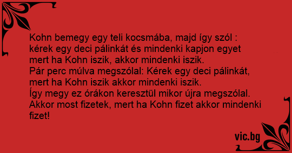 Kohn bemegy egy teli kocsmába, majd így szól : kérek egy deci pálinkát és mindenki kapjon egyet mert ha Kohn iszik, akkor mindenki iszik.