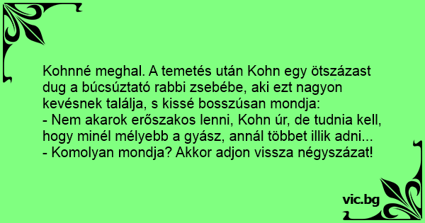 Kohnné meghal. A temetés után Kohn egy ötszázast dug a búcsúztató rabbi zsebébe, aki ezt nagyon kevésnek találja, s kissé bosszúsan mondja: