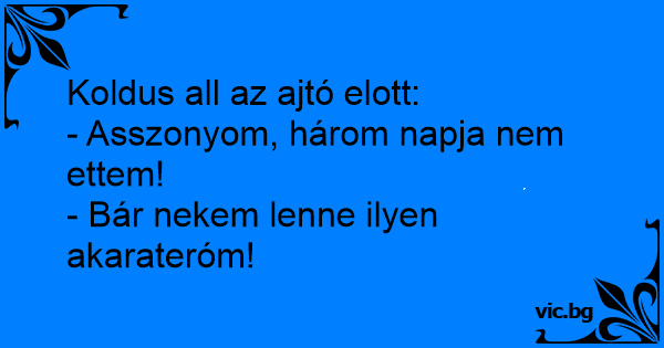 Дебелата дама и просјакот Просяк доближил добре облечена дама, излизаща от скъп магазин и и казал: A beggar walks up to a well-dressed woman out shopping. ‘I haven’t eaten anything in four days,’ he says. She looks at him and says, ‘God, I wish I had your willpower.’ Um mendigo se aproxima de uma senhora cheia de sacolas de compras que ia andando na rua e fala: — Madame, eu estou sem comer há 4 dias. E a madame: — Meu Deus! Eu gostaria de ter sua força de vontade! Dans les beaux quartiers de la capitale, un clochard s’approche d’une femme distinguée qui est en train de faire du lèche-vitrines. Le pauvre homme lui dit d’un air implorant: – Madame, je n’ai pas... Kommt ein fetter Kerl aus der Pommes Bude. In der Hand hat er eine riesen Bockwurst, eine große Portion Pommes und eine große Cola. Am Gehweg sitzt ein Bettler und sagt zu ihm: "ich hab schon seit... Une énorme femme sort d'une boulangerie avec des pâtisseries plein les bras. Un SDF l'accoste et lui dit : - Madame, ça fait 3 jours que je n'ai pas mangé ! - Ah, si seulement j'avais votre volonté ! Lihava rouva oli menossa Stockmannille, kun köyhä ja laiha kerjäläinen ojensi kättään häntä kohti sanoen: - Hyvä rouva, en ole syönyt kolmeen päivään. Rouva katsoi kerjäläistä hämmästellen ja... Żebrak do eleganckiej kobiety: - Nie jadłem od czterech dni. - Chciałabym mieć Twoją siłę woli. A koldus becsenget Kohnékhoz. A kövér Kohnné nyit ajtót: - Nagyságos asszonyom két napja nem ettem semmit! - Bárcsak nekem lenne ilyen akaraterőm. O mendigo vai até um condomínio de gente bem rica e bate na porta de uma madame. Ela atende e ele fala: — Por favor, a senhora não tem um mísero pão para dar a um homem que não come a uma semana!!!...