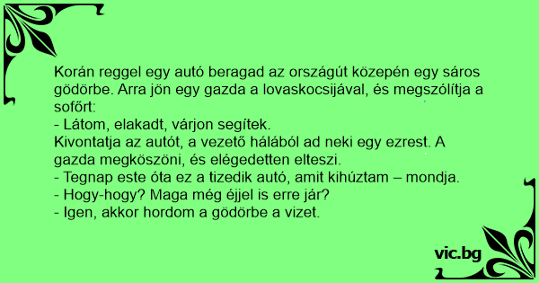 Korán reggel egy autó beragad az országút közepén egy sáros gödörbe. Arra jön egy gazda a lovaskocsijával, és megszólítja a sofőrt: