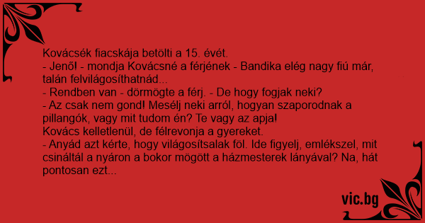 - Jenő! - mondja Kovácsné a férjének - Bandika elég nagy fiú már, talán felvilágosíthatnád...