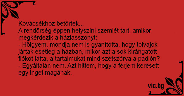 - Hölgyem, mondja nem is gyanította, hogy tolvajok jártak esetleg a házban, mikor azt a sok kirángatott fiókot látta, a tartalmukat mind szétszórva a padlón?