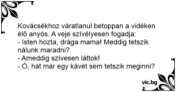 Kovácsékhoz váratlanul betoppan a vidéken élő anyós. A veje szívélyesen fogadja: