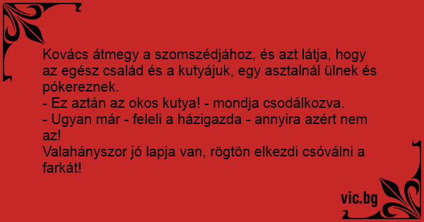 Kovács átmegy a szomszédjához, és azt látja, hogy az egész család és a kutyájuk, egy asztalnál ülnek és pókereznek.