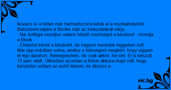 Kovács úr a héten már harmadszorra késik el a munkahelyéről. Balszerencséjére a főnöke már az íróasztalánál várja: