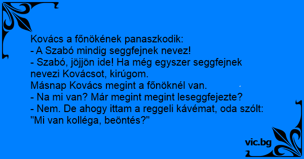 - Szabó, jöjjön ide! Ha még egyszer seggfejnek nevezi Kovácsot, kirúgom.