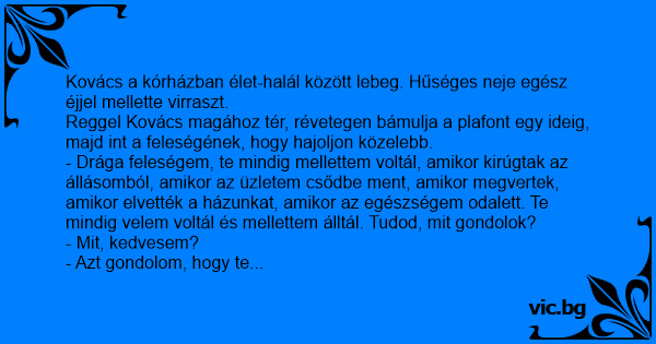 Reggel Kovács magához tér, révetegen bámulja a plafont egy ideig, majd int a feleségének, hogy hajoljon közelebb.