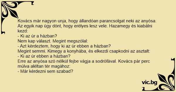 Kovács már nagyon unja, hogy állandóan parancsolgat neki az anyósa. Az egyik nap úgy dönt, hogy erélyes lesz vele. Hazamegy és kiabálni kezd: