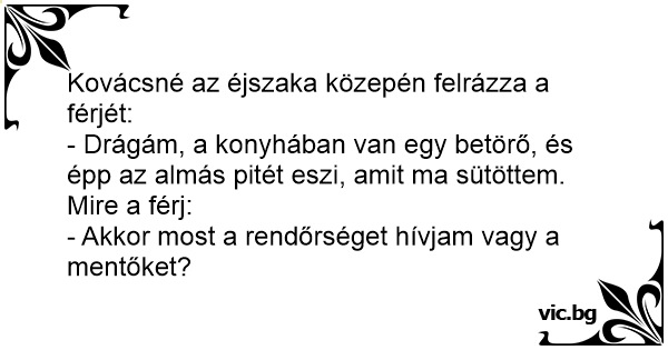 - Drágám, a konyhában van egy betörő, és épp az almás pitét eszi, amit ma sütöttem.