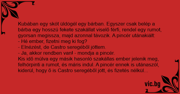 Kubában egy skót üldögél egy bárban. Egyszer csak belép a bárba egy hosszú fekete szakállat viselő férfi, rendel egy rumot, gyorsan megissza, majd azonnal távozik. A pincér utánakiált: - Hé ember, fizetni meg ki fog? - Elnézést, de Castro seregéből jöttem. - Ja, akkor rendben van! - mondja a pincér. Kis idő múlva egy másik hasonló szakállas ember jelenik meg, felhörpinti a rumot, és máris indul. A pincér ennek is utánaszól, kiderül, hogy ő is Castro seregéből jött, és fizetés nélkül elmehet. A skót elgondolkodik, majd feláll, odamegy a pulthoz, és rendel egy rumot. Megissza és már indul is ki a bárból. Utánaszól a pincér: - Hé, maga! Fizetni ki fog? A skót ránéz: - Elnézést, Castro seregéből jöttem! - Na de, hol van a szakálla? A skót közelebb lép, felemeli a szoknyáját, és odasúgja: - Psszt! Titkosszolgálat!