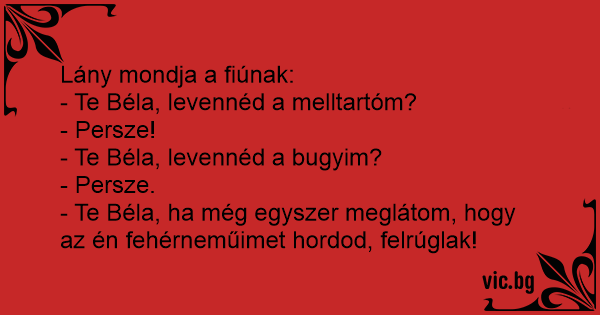 - Te Béla, ha még egyszer meglátom, hogy az én fehérneműimet hordod, felrúglak!