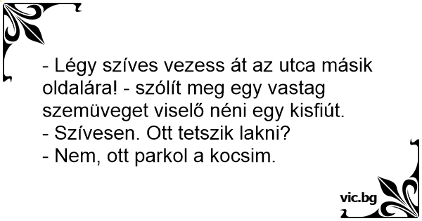 - Légy szíves vezess át az utca másik oldalára! - szólít meg egy vastag szemüveget viselő néni egy kisfiút.
