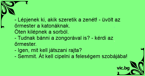 - Lépjenek ki, akik szeretik a zenét! - üvölt az őrmester a katonáknak.