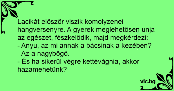 Lacikát először viszik komolyzenei hangversenyre. A gyerek meglehetősen unja az egészet, fészkelődik, majd megkérdezi: