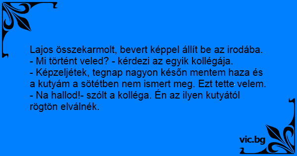 - Képzeljétek, tegnap nagyon későn mentem haza és a kutyám a sötétben nem ismert meg. Ezt тетте velem.