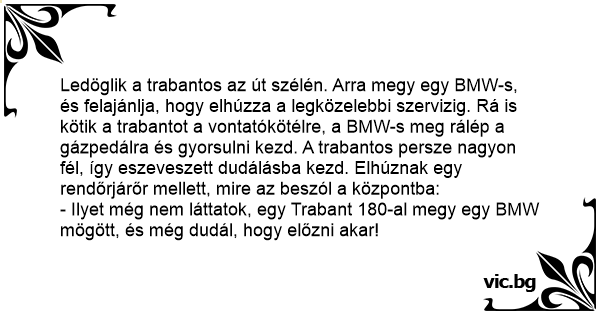 Ledöglik a trabantos az út szélén. Arra megy egy BMW-s, és felajánlja, hogy elhúzza a legközelebbi szervizig. Rá is kötik a trabantot a vontatókötélre, a BMW-s meg rálép a gázpedálra és gyorsulni kezd. A trabantos persze nagyon fél, így eszeveszett dudálásba kezd. Elhúznak egy rendőrjárőr mellett, mire az beszól a központba: