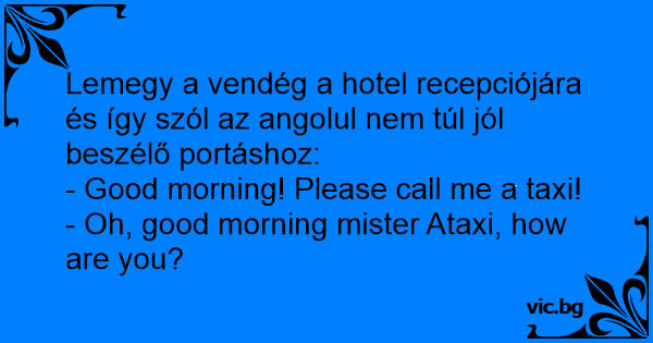 Lemegy a vendég a hotel recepciójára és így szól az angolul nem túl jól beszélő portáshoz: