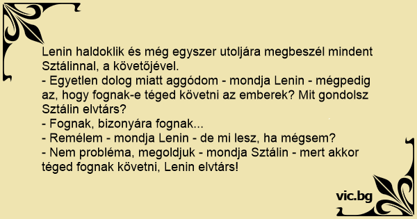 - Egyetlen dolog miatt aggódom - mondja Lenin - mégpedig az, hogy fognak-e téged követni az emberek? Mit gondolsz Sztálin elvtárs?