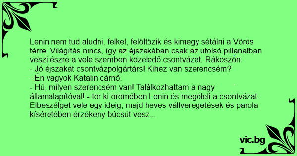 - Hú, milyen szerencsém van! Találkozhattam a nagy államalapítóval! - tör ki örömében Lenin és megöleli a csontvázat. Elbeszélget vele egy ideig, majd heves vállveregetések és parola kíséretében érzékeny búcsút vesz társától. Élményekkel eltelve tér nyugovóra. Másnap éjszaka megint csak forgolódik az ágyában, így ismét sétára szánja el magát. A sötétben csak az utolsó pillanatban veszi észre a vele szemben közeledő csontvázat. Ráköszön: