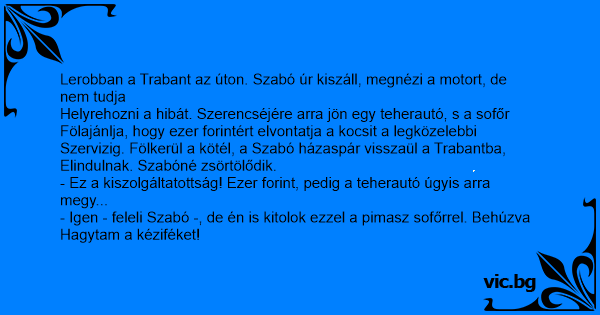 - Igen - feleli Szabó -, de én is kitolok ezzel a pimasz sofőrrel. Behúzva