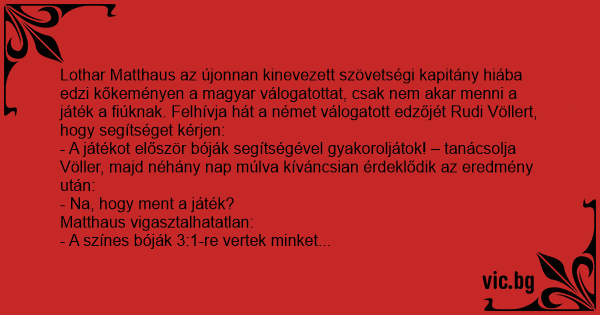 Lothar Matthaus az újonnan kinevezett szövetségi kapitány hiába edzi kőkeményen a magyar válogatottat, csak nem akar menni a játék a fiúknak. Felhívja hát a német válogatott edzőjét Rudi Völlert, hogy segítséget kérjen: